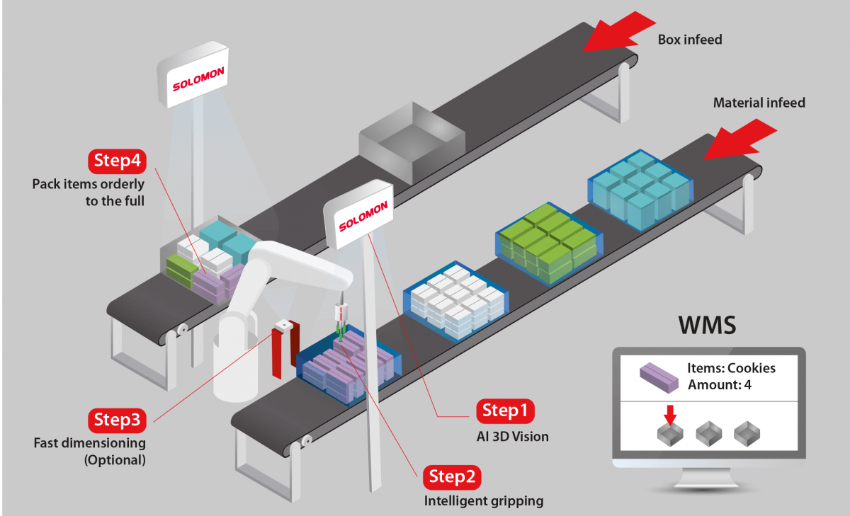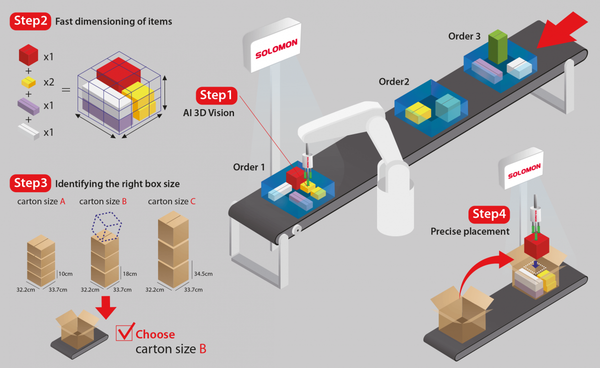 Solomon AccuPick SmartPack represents the state-of-the-art robotic pick-and-place packaging solution (Intelligent Packaging Solution). Powered by advanced AI and 3D vision, SmartPack ensures boxes/bins are filled optimally for various types of packaging applications. Beyond automating a traditionally manual task, SmartPack generates a superior return on investment by reducing the dimensional weight of the packages, lowering both shipping costs and the amount of packaging materials used.